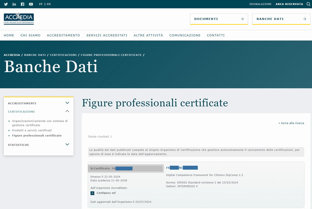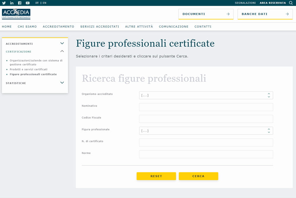 Sul sito Accredia puoi verificare online la validità della tua certificazione tramite codice fiscale o numero di certificato